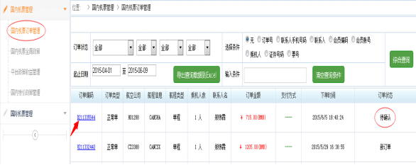 ①進入微商旅後台——機票——國内訂單管理——國内機票訂單管理——待確(què)認訂單,點擊訂單編(biān)碼,