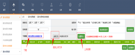 ①如果要上傳(chuán)比較多本地特價政策,建議先下載“國内機票特價政策模闆”,填寫好後,再選擇文件,點擊批量導(dǎo)入即可。