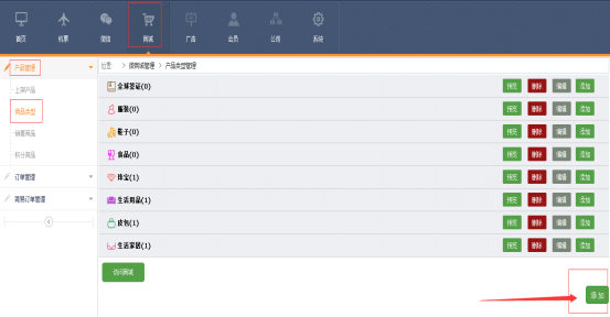 1、如需添加一級子菜單,點(diǎn)擊【商城】——産(chǎn)品管理——商品類型——添加,按頁面要求填寫好産(chǎn)品類别,保存即可。