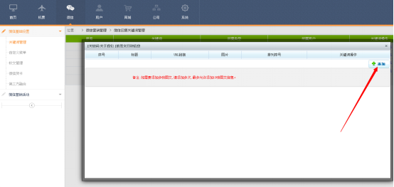 第一步:進入微商旅後(hòu)台,點(diǎn)擊“微信”--“微信基礎設置”--“關鍵詞管理”--“添加 ”;