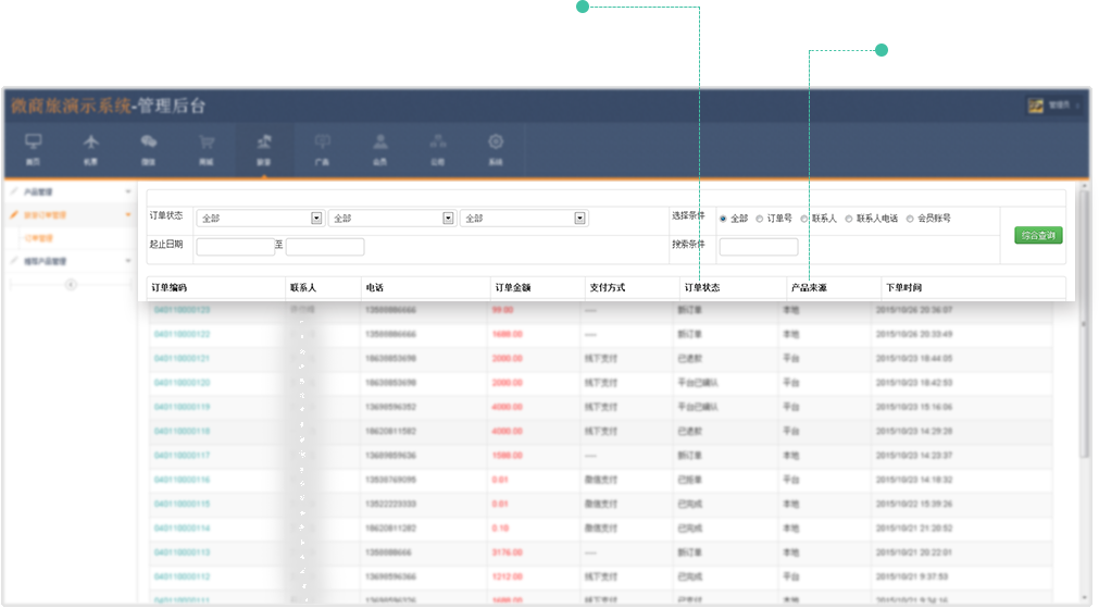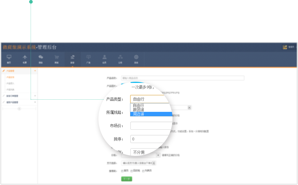 周邊(biān)遊、自由行、跟團遊等統一管理維護,數據實時同步微信公衆号,輕松管理産(chǎn)品上下架,銷售數據,價格等内容。