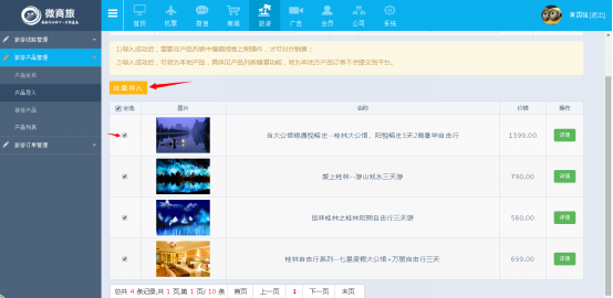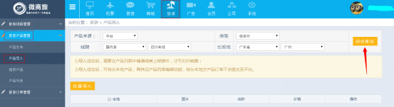 ⑴ 點擊【旅遊】——旅遊産(chǎn)品管理——産(chǎn)品導(dǎo)入,選擇好産(chǎn)品類型、線路、出發地,點擊