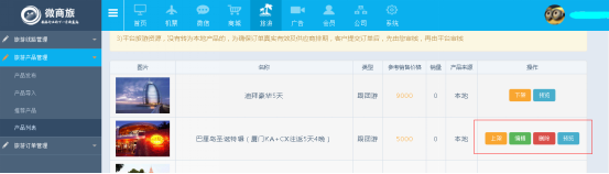 管理平台當(dāng)前添加的所有旅遊産(chǎn)品,可修改、上架、下架、删除。