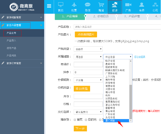 ⑶點(diǎn)擊【旅遊】——旅遊産(chǎn)品管理——産(chǎn)品發布——所屬路線,即可看到添加的自定義旅遊線路。