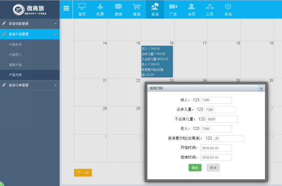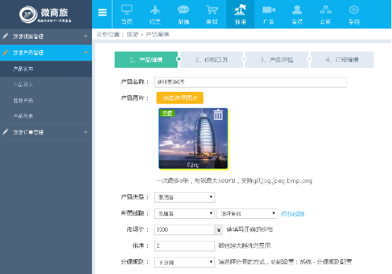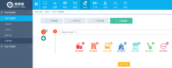 ⑴ 點(diǎn)擊【旅遊】——旅遊産(chǎn)品管理——産(chǎn)品發布,按頁面要求填寫好産(chǎn)品内容,點(diǎn)擊下一步即可。